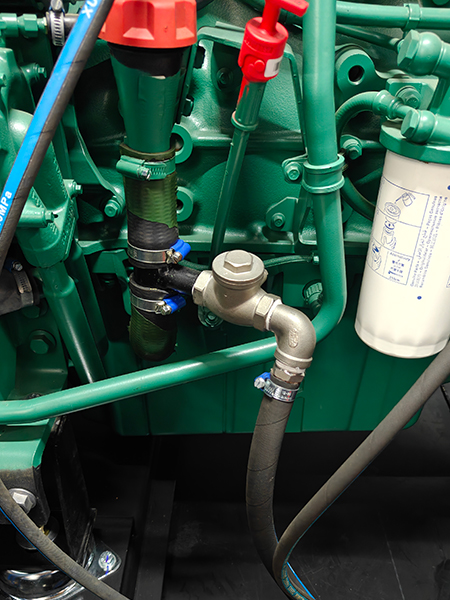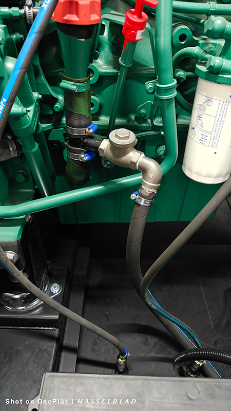 Volvo Penta engine customized with automatic oil fill and drain ports, plus design flaw improvements for enhanced performance.